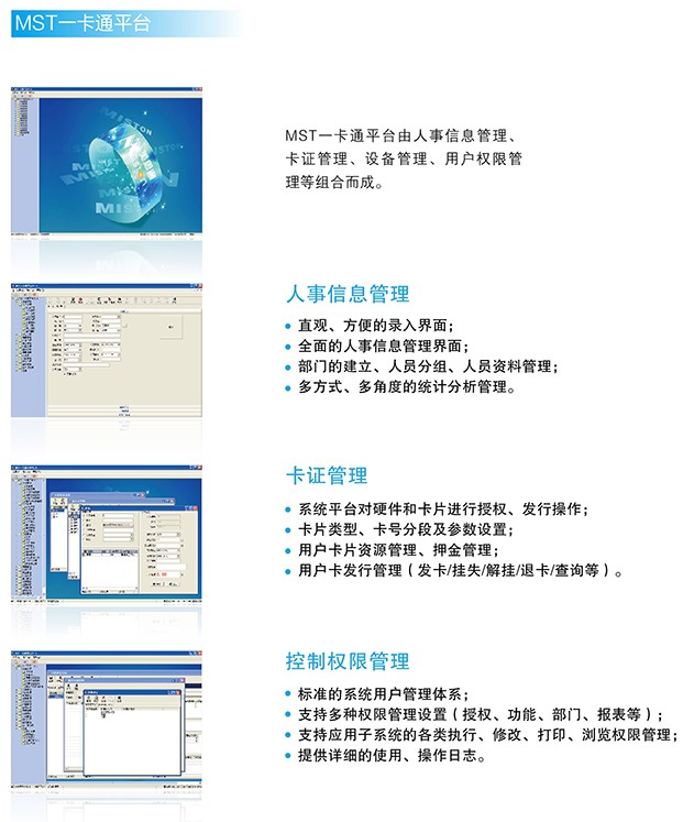 美思通一卡通管理系統(tǒng)平臺具有統(tǒng)一管理、集中控制、數(shù)據(jù)共享、操作簡單、安全穩(wěn)定的五大特點。系統(tǒng)包含門禁、考勤、車輛、梯控、消費、訪客、通道管理等子系統(tǒng),所有子系統(tǒng)都在一個控制平臺上管理。